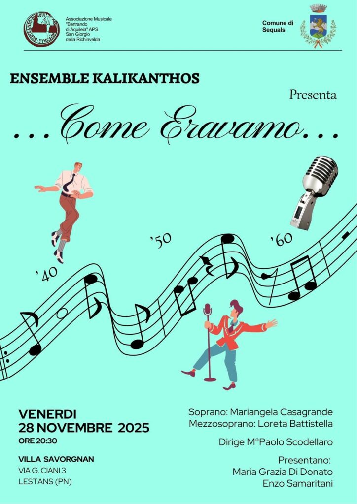 L’Associazione “Musicale Bertrando d’Aquileia” organizza il concerto “Come eravamo…” dell’ensemble Kalikanthos, che proporrà un repertorio con musiche degli anni ’30, ’40, ’50 e ’60.